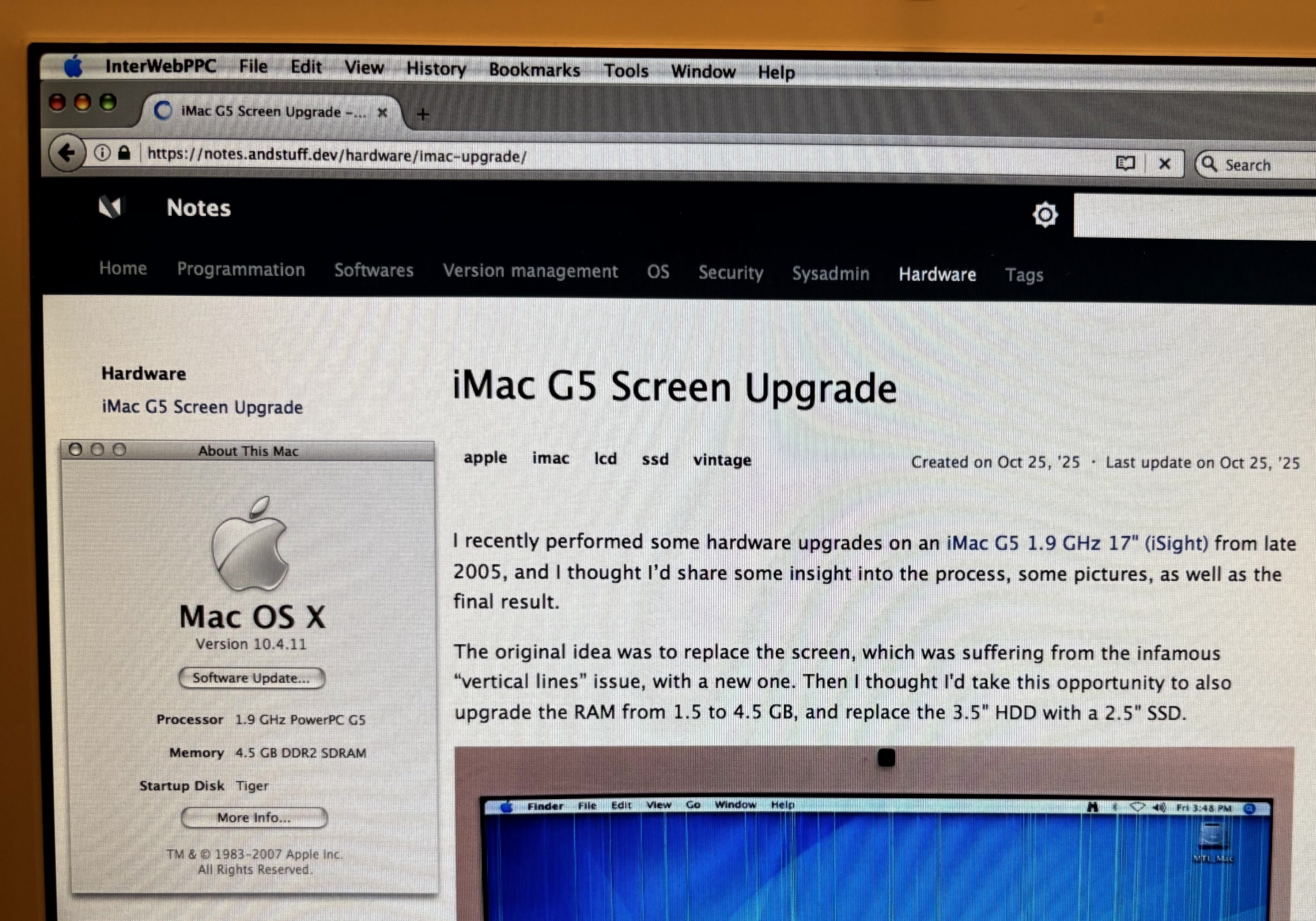 I recently performed some hardware upgrades on an iMac G5 1.9 GHz 17" (iSight) from late 2005, and I thought I’d share some insight into the process, some pictures, as well as the final result.