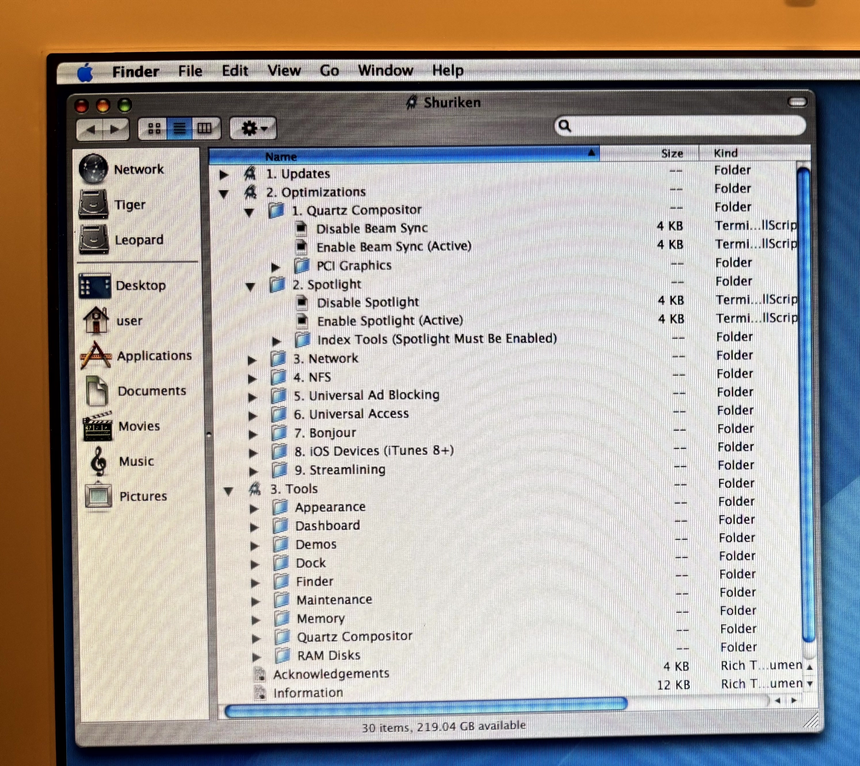 Shuriken is a collection of scripts for Tiger, mainly aimed at improving system performance. Sorbet Leopard is a modified version of Leopard that includes updated certificates, performance tweaks, and other patches. Both were created by the same developer but are no longer maintained.